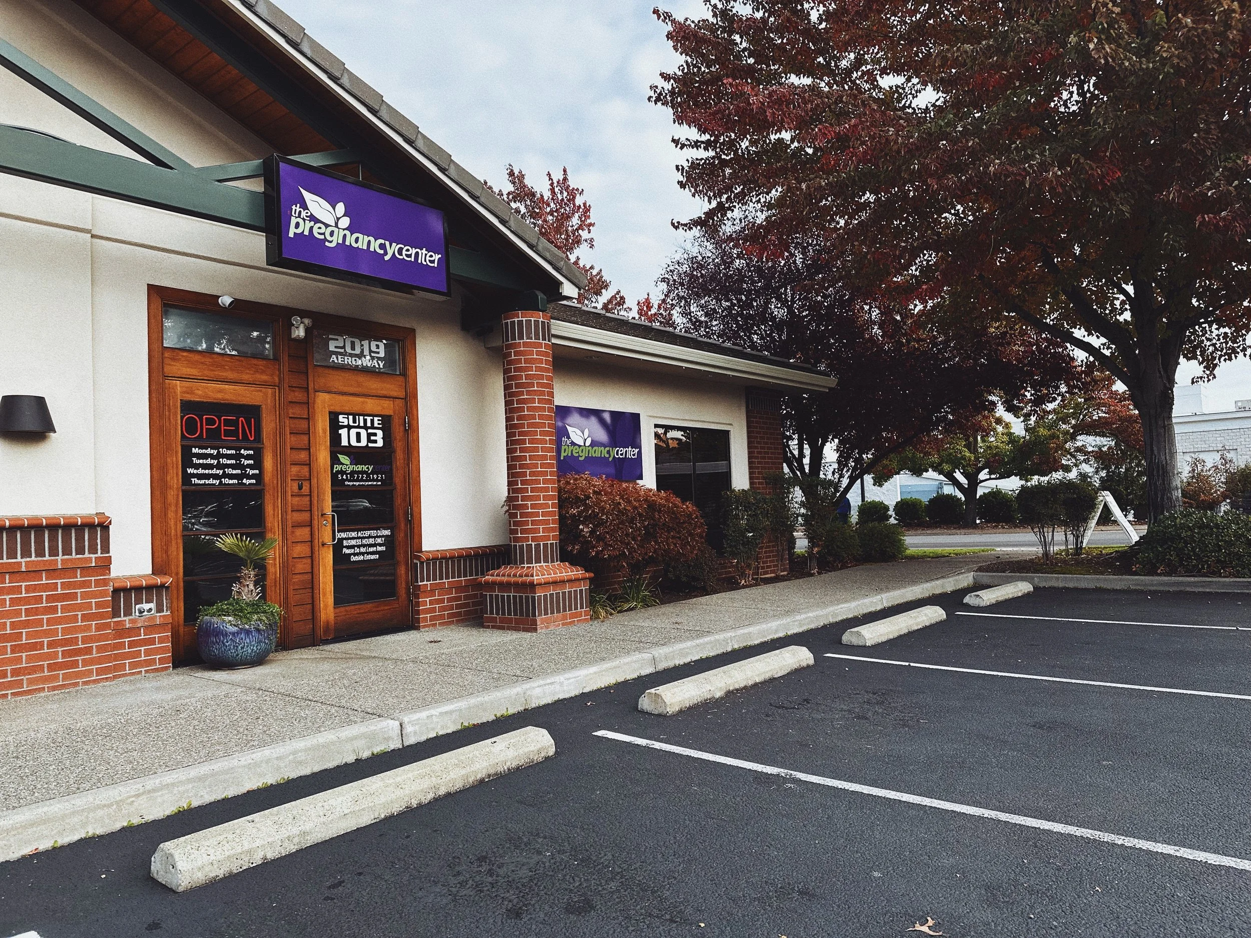 Exterior view of a pregnancy center building with a purple sign that reads 'The Pregnancy Center,' a glass door with an 'Open' sign and window signs, storefront windows, brick pillars, and a parking lot with marked parking spaces, surrounded by trees with fall foliage.